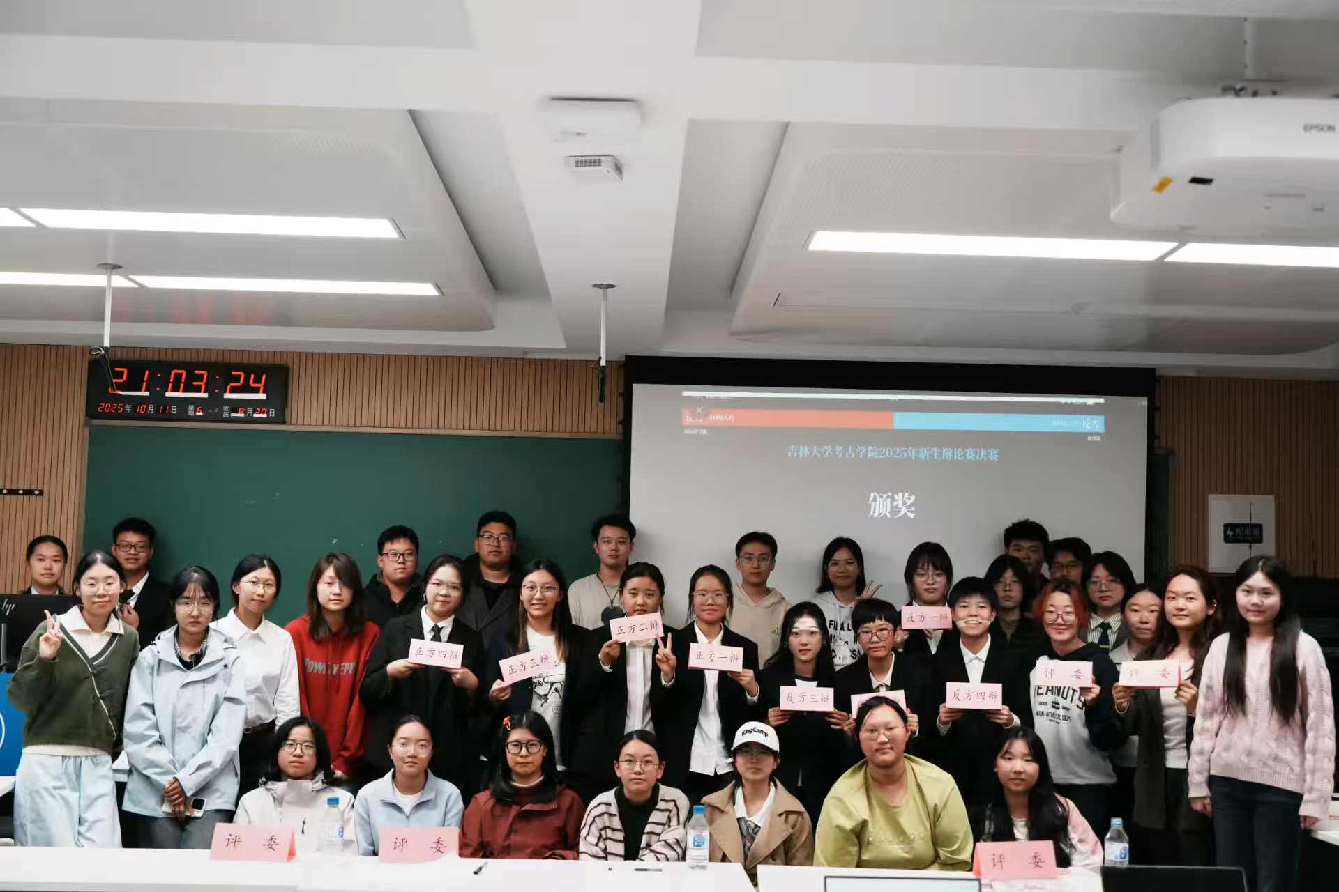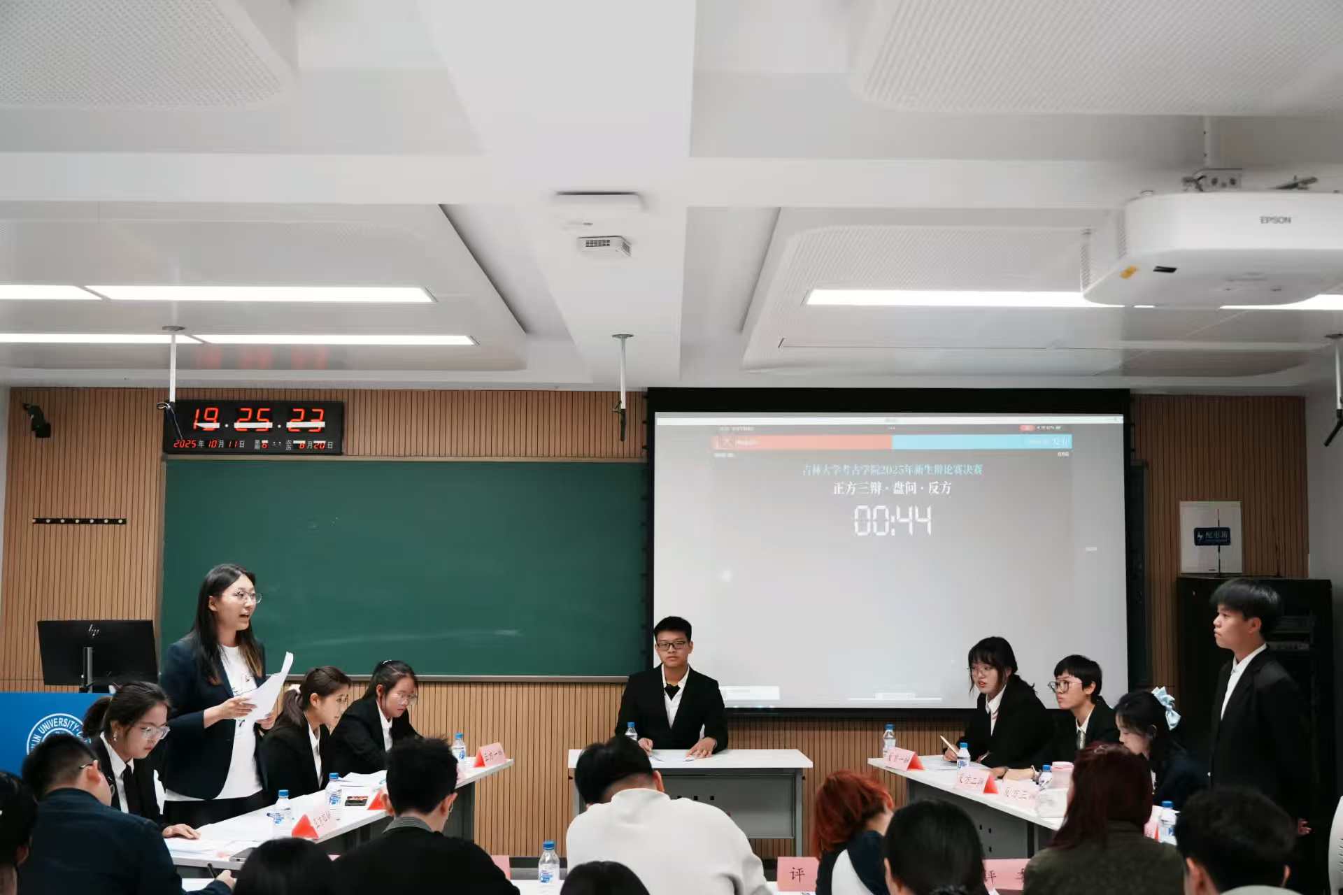 2025年10月11日晚,吉林大学考古学院新生辩论赛决赛于敬信教学楼A区103教室举行,本场辩论赛由院团委文体部主办,考古学院王为健担任主席、彭雨菲计时,邀请到了计算机科学与技术学院闫俊、白求恩第二临床医学院王为一、物理学院武轩震、考古学院孙凤涓、考古学院闫志璇五位评委莅临指导。