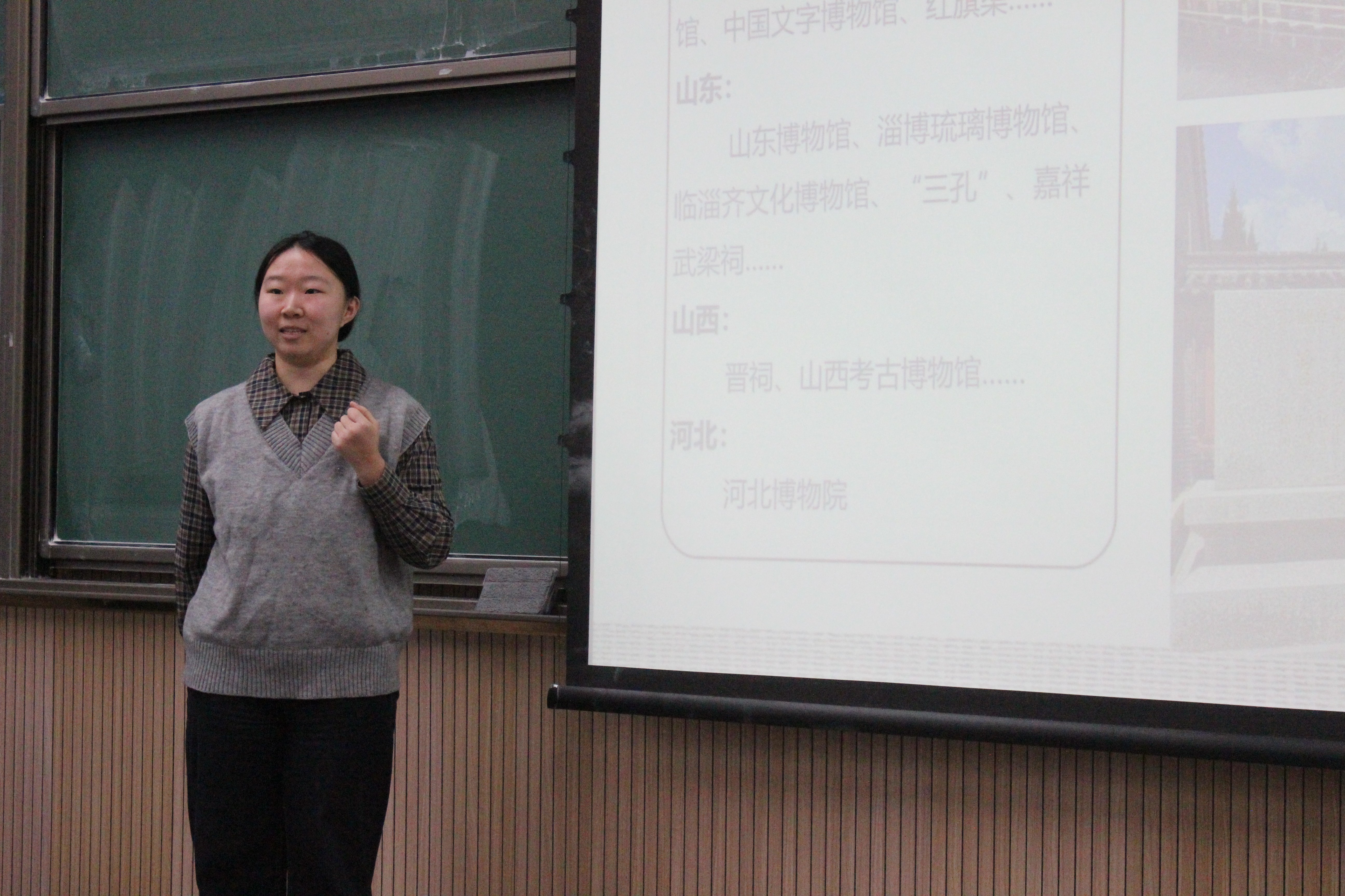随后,文物与博物馆学专业的李禹恒、王笑扬两位同学联袂分享。他们结合在安阳殷墟博物馆、山西青铜博物馆的实习经历,从实习概况、日常工作、文化遗产地调研、衣食住行安排及结业考察五个维度,全方位拆解文博领域的实习要点。两人还分享了博物馆活动策划、配套讲解、海报设计、PPT 制作等实操工作的心得,同时强调展板内容需精准严谨。他们的分享让同学们深刻认识到,现代文博实习不仅需要扎实的专业功底,更考验运用新媒介、新思维讲好文物故事的综合能力。